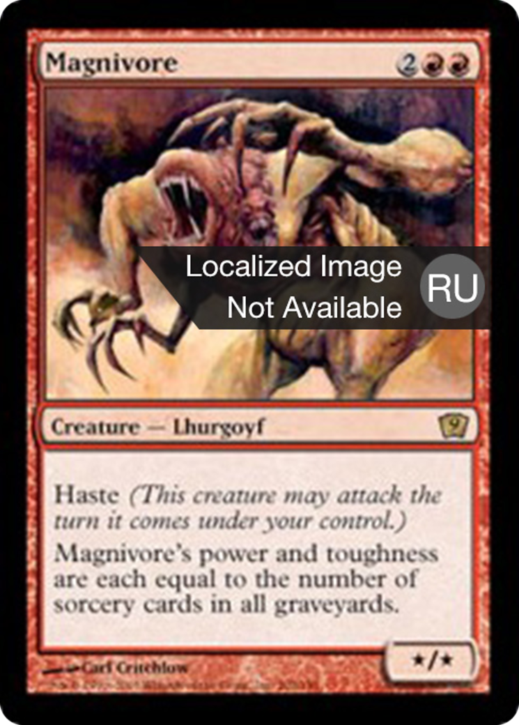 Haste (This creature can attack and {T} as soon as it comes under your control.) Magnivore's power and toughness are each equal to the number of sorcery cards in all graveyards.