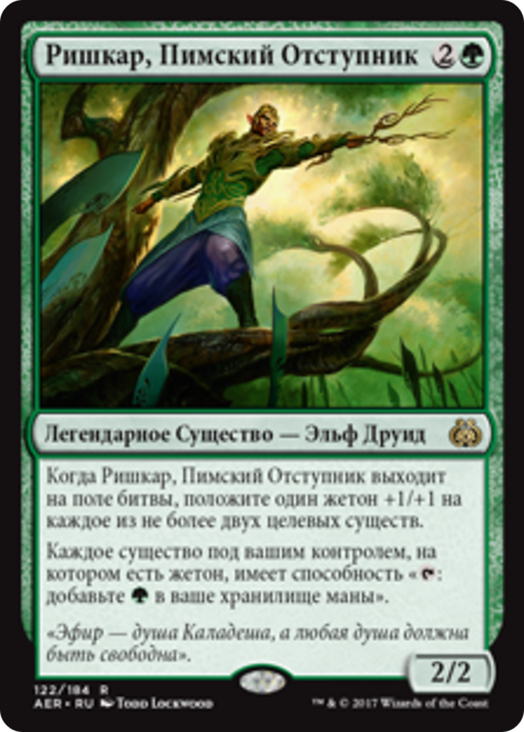 When Rishkar, Peema Renegade enters the battlefield, put a +1/+1 counter on each of up to two target creatures.
