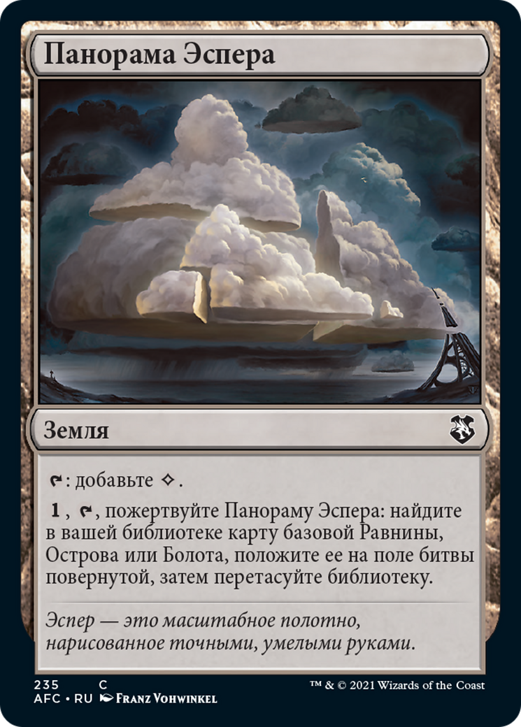 {T}: Add {C}. {1}, {T}, Sacrifice Esper Panorama: Search your library for a basic Plains, Island, or Swamp card, put it onto the battlefield tapped, then shuffle.