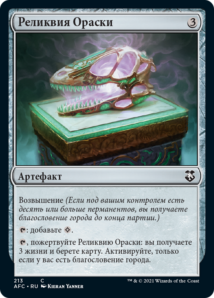 {T}, Sacrifice Orazca Relic: You gain 3 life and draw a card. Activate only if you have the city's blessing.
