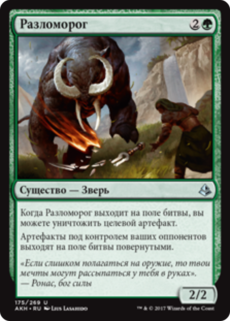 When Manglehorn enters the battlefield, you may destroy target artifact. Artifacts your opponents control enter the battlefield tapped.