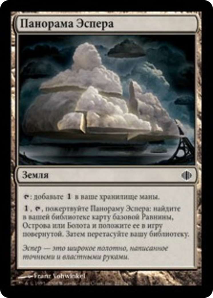 {1}, {T}, Sacrifice Esper Panorama: Search your library for a basic Plains, Island, or Swamp card, put it onto the battlefield tapped, then shuffle.