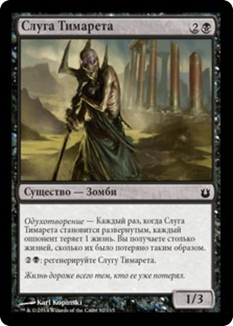 Inspired — Whenever Servant of Tymaret becomes untapped, each opponent loses 1 life. You gain life equal to the life lost this way. {2}{B}: Regenerate Servant of Tymaret.