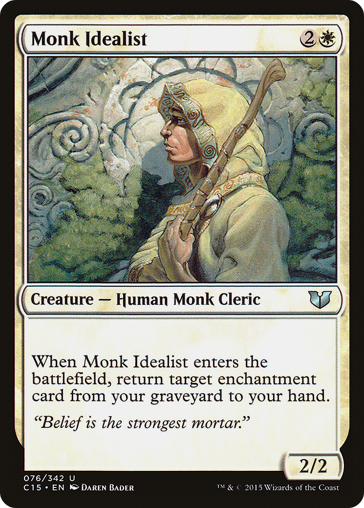 When Monk Idealist enters the battlefield, return target enchantment card from your graveyard to your hand.