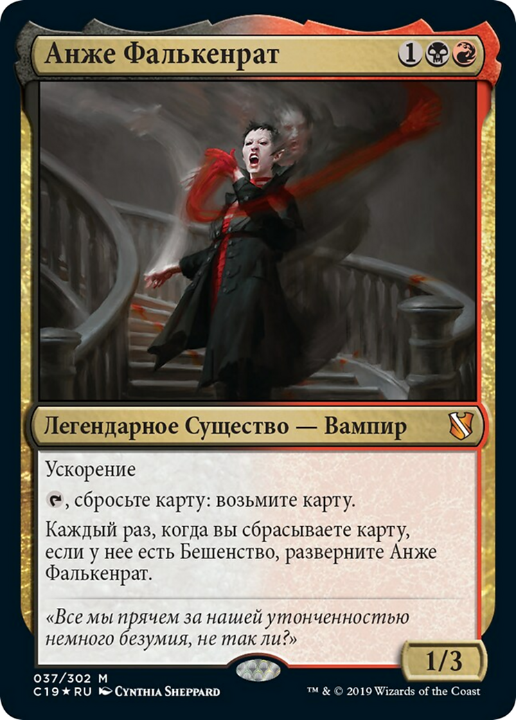 Haste {T}, Discard a card: Draw a card. Whenever you discard a card, if it has madness, untap Anje Falkenrath.