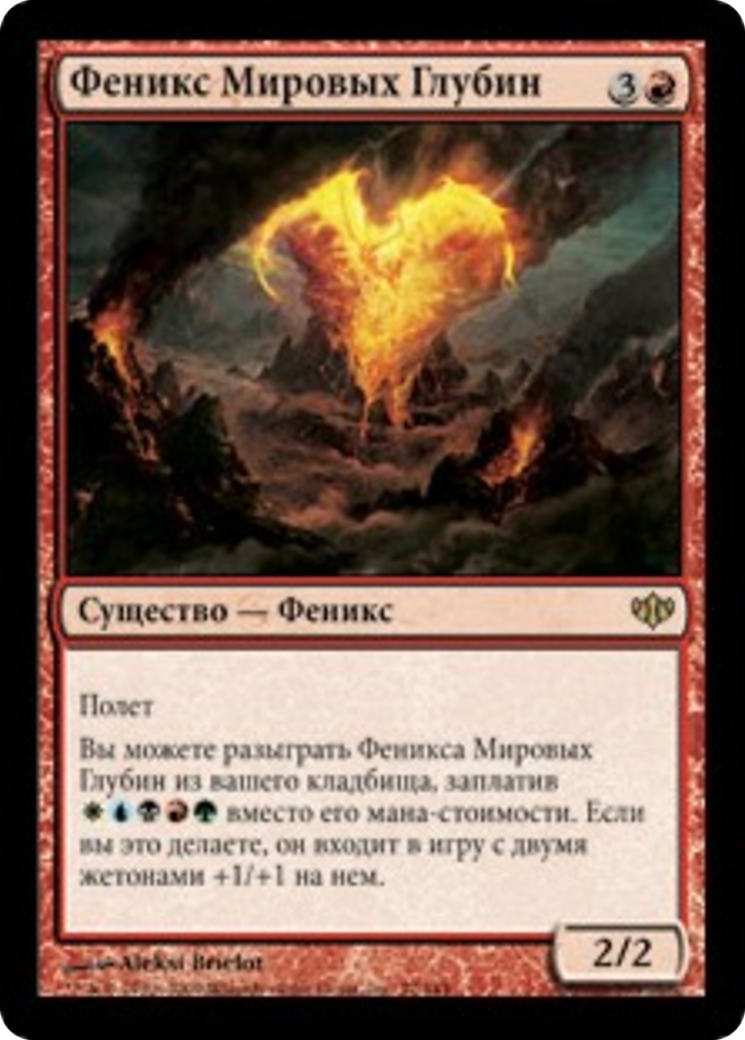 You may cast Worldheart Phoenix from your graveyard by paying {W}{U}{B}{R}{G} rather than paying its mana cost. If you do, it enters the battlefield with two +1/+1 counters on it.