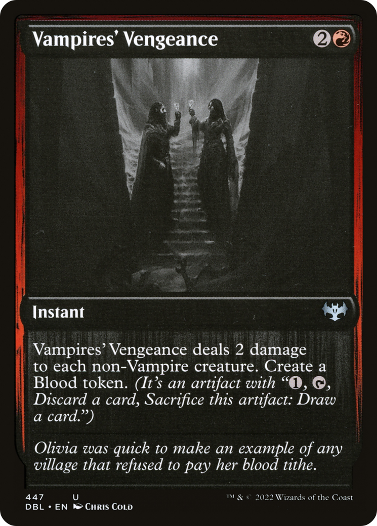 Vampires' Vengeance deals 2 damage to each non-Vampire creature. Create a Blood token. (It's an artifact with "{1}, {T}, Discard a card, Sacrifice this artifact: Draw a card.")