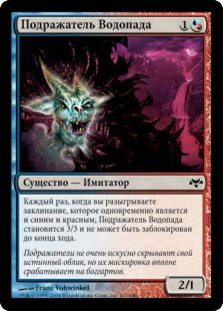 Whenever you cast a spell that's both blue and red, Riverfall Mimic has base power and toughness 3/3 until end of turn and can't be blocked this turn.