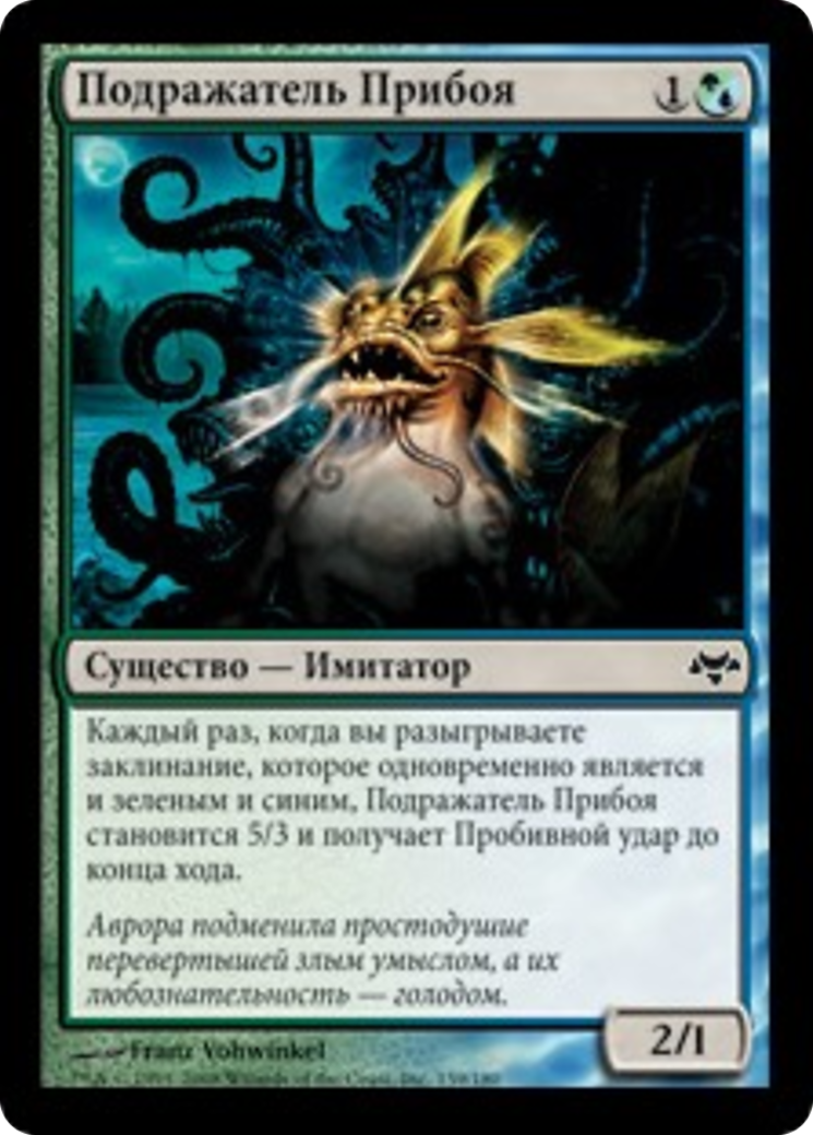 Whenever you cast a spell that's both green and blue, Shorecrasher Mimic has base power and toughness 5/3 until end of turn and gains trample until end of turn.