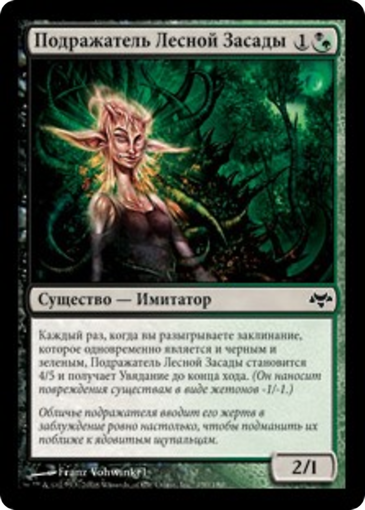 Whenever you cast a spell that's both black and green, Woodlurker Mimic has base power and toughness 4/5 until end of turn and gains wither until end of turn. (It deals damage to creatures in the form of -1/-1 counters.)