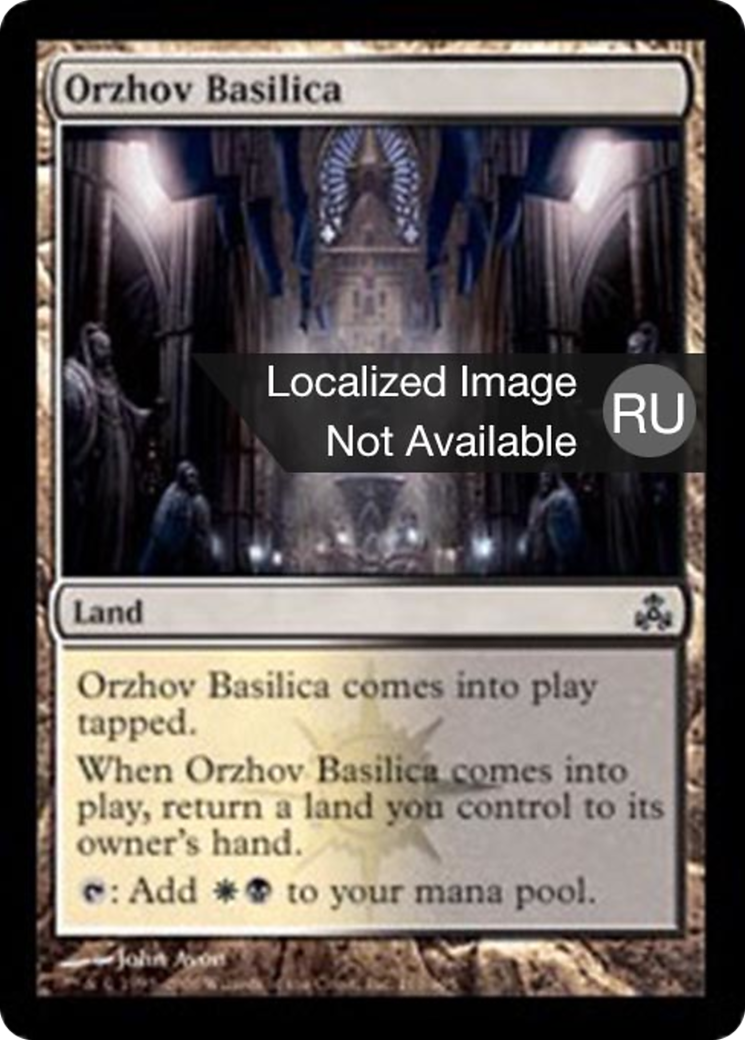 When Orzhov Basilica enters the battlefield, return a land you control to its owner's hand.