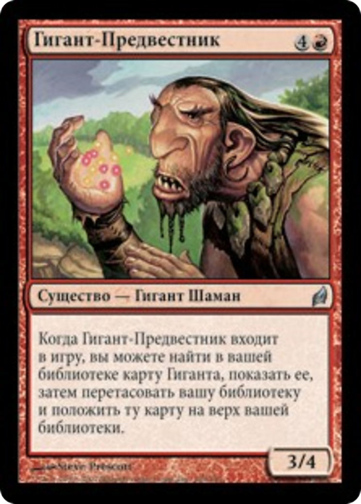 When Giant Harbinger enters the battlefield, you may search your library for a Giant card, reveal it, then shuffle and put that card on top.