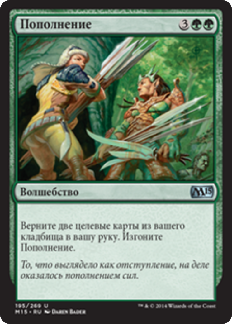Return two target cards from your graveyard to your hand. Exile Restock.