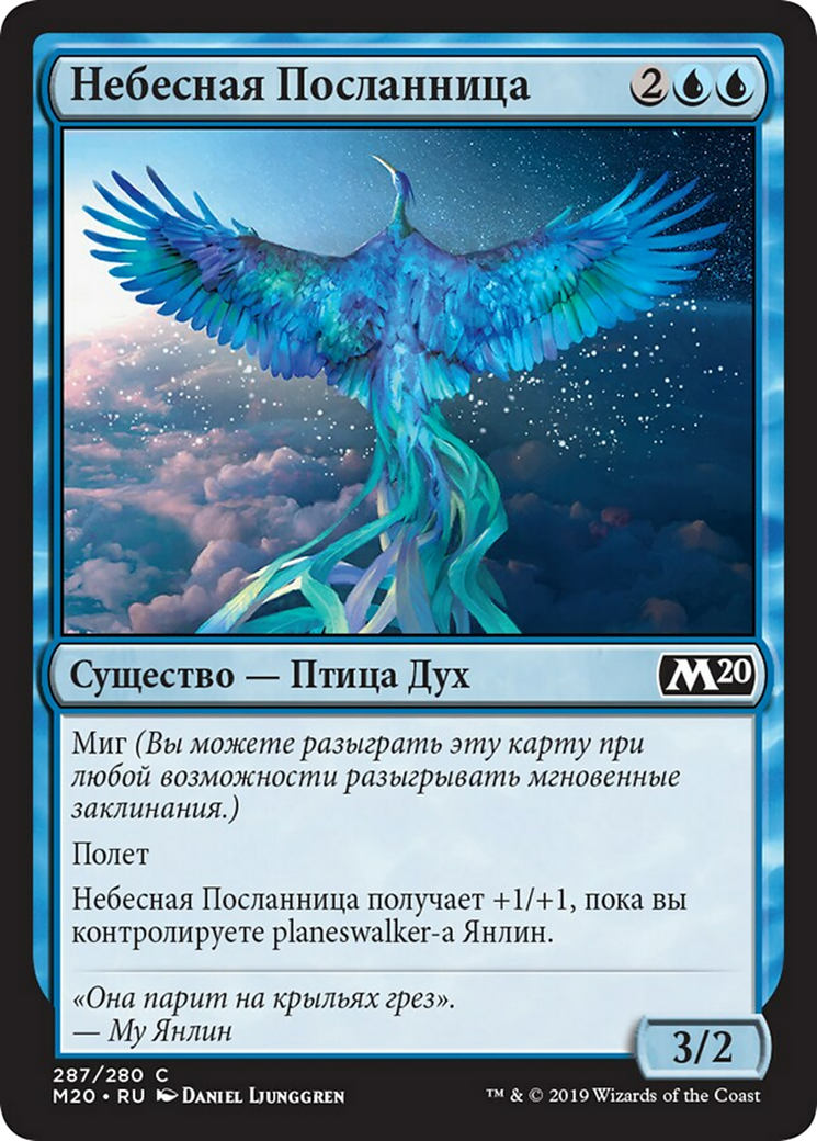 Flash (You may cast this card any time you could cast an instant.) Flying Celestial Messenger gets +1/+1 as long as you control a Yanling planeswalker.
