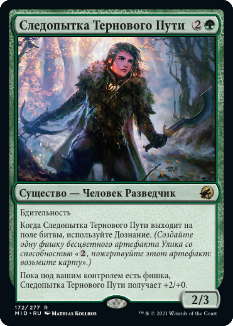 When Briarbridge Tracker enters the battlefield, investigate. (Create a Clue token. It's an artifact with "{2}, Sacrifice this artifact: Draw a card.")