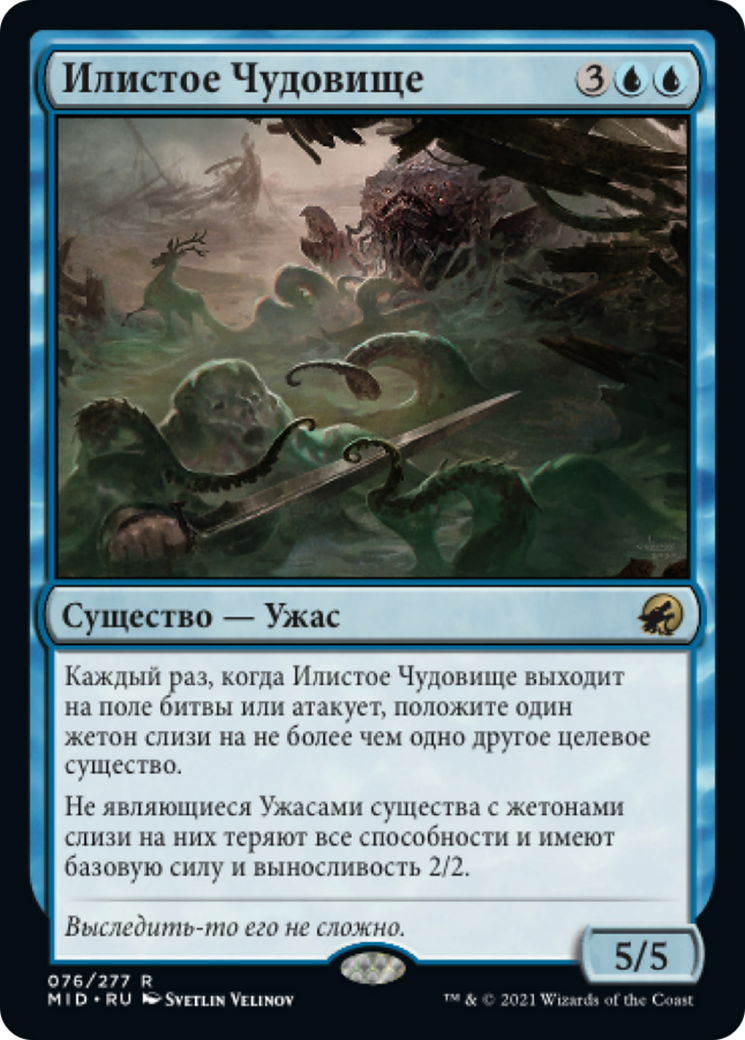 Whenever Sludge Monster enters the battlefield or attacks, put a slime counter on up to one other target creature. Non-Horror creatures with slime counters on them lose all abilities and have base power and toughness 2/2.
