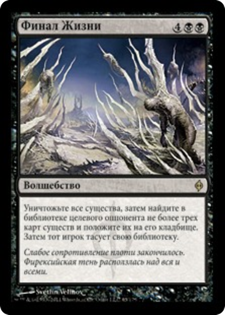Destroy all creatures, then search target opponent's library for up to three creature cards and put them into their graveyard. Then that player shuffles.
