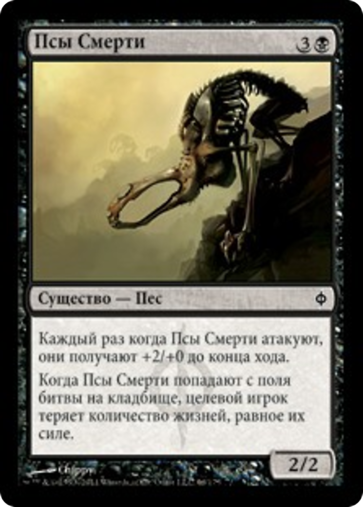 Whenever Mortis Dogs attacks, it gets +2/+0 until end of turn. When Mortis Dogs dies, target player loses life equal to its power.