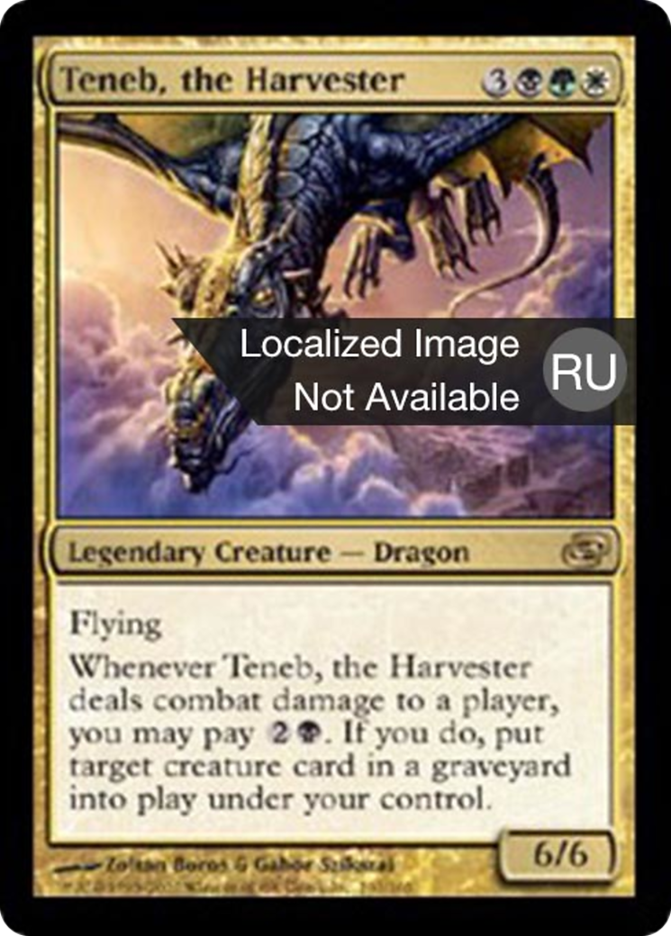 Flying Whenever Teneb, the Harvester deals combat damage to a player, you may pay {2}{B}. If you do, put target creature card from a graveyard onto the battlefield under your control.