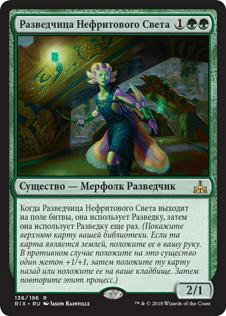 When Jadelight Ranger enters the battlefield, it explores, then it explores again. (Reveal the top card of your library. Put that card into your hand if it's a land. Otherwise, put a +1/+1 counter on this creature, then put the card back or put it into your graveyard. Then repeat this process.)