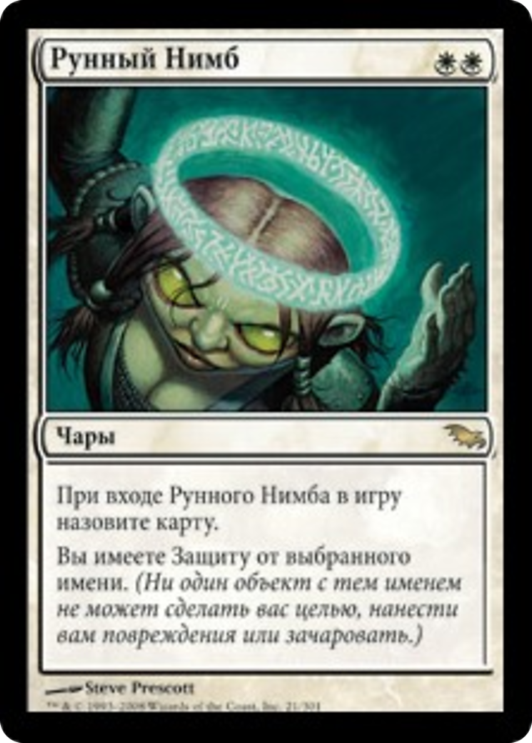 You have protection from the chosen card name. (You can't be targeted, dealt damage, or enchanted by anything with that name.)