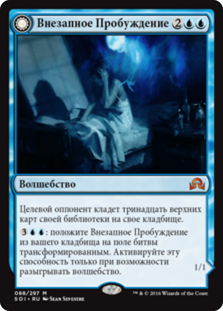 Target opponent mills thirteen cards. {3}{U}{U}: Put Startled Awake from your graveyard onto the battlefield transformed. Activate only as a sorcery.