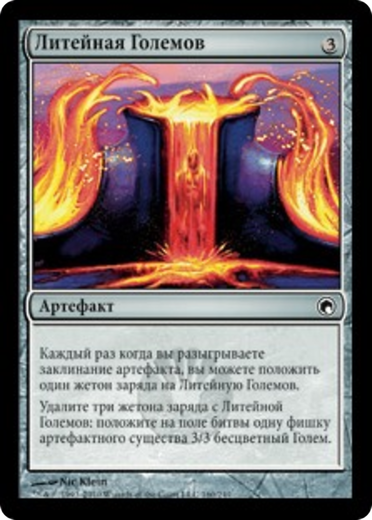 Whenever you cast an artifact spell, you may put a charge counter on Golem Foundry. Remove three charge counters from Golem Foundry: Create a 3/3 colorless Golem artifact creature token.