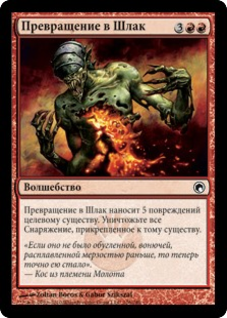 Turn to Slag deals 5 damage to target creature. Destroy all Equipment attached to that creature.