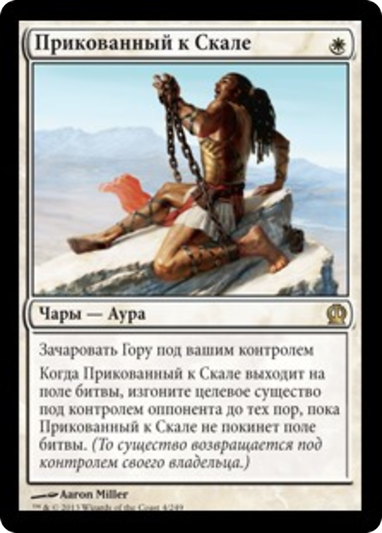 Enchant Mountain you control When Chained to the Rocks enters the battlefield, exile target creature an opponent controls until Chained to the Rocks leaves the battlefield. (That creature returns under its owner's control.)