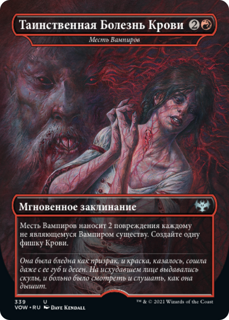 Vampires' Vengeance deals 2 damage to each non-Vampire creature. Create a Blood token. (It's an artifact with "{1}, {T}, Discard a card, Sacrifice this artifact: Draw a card.")