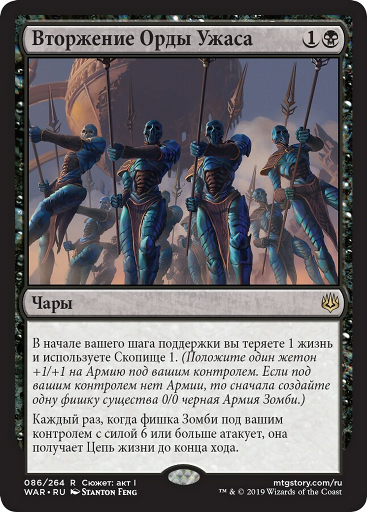 At the beginning of your upkeep, you lose 1 life and amass Zombies 1. (Put a +1/+1 counter on an Army you control. It's also a Zombie. If you don't control an Army, create a 0/0 black Zombie Army creature token first.)