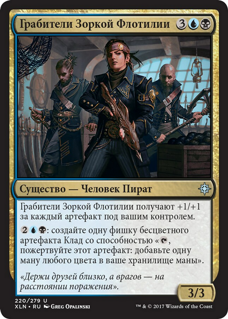 Deadeye Plunderers gets +1/+1 for each artifact you control. {2}{U}{B}: Create a Treasure token. (It's an artifact with "{T}, Sacrifice this artifact: Add one mana of any color.")