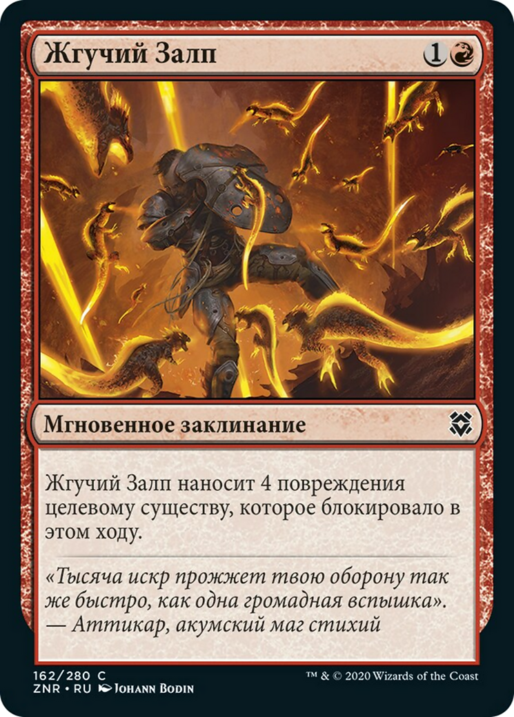 Sizzling Barrage deals 4 damage to target creature that blocked this turn.