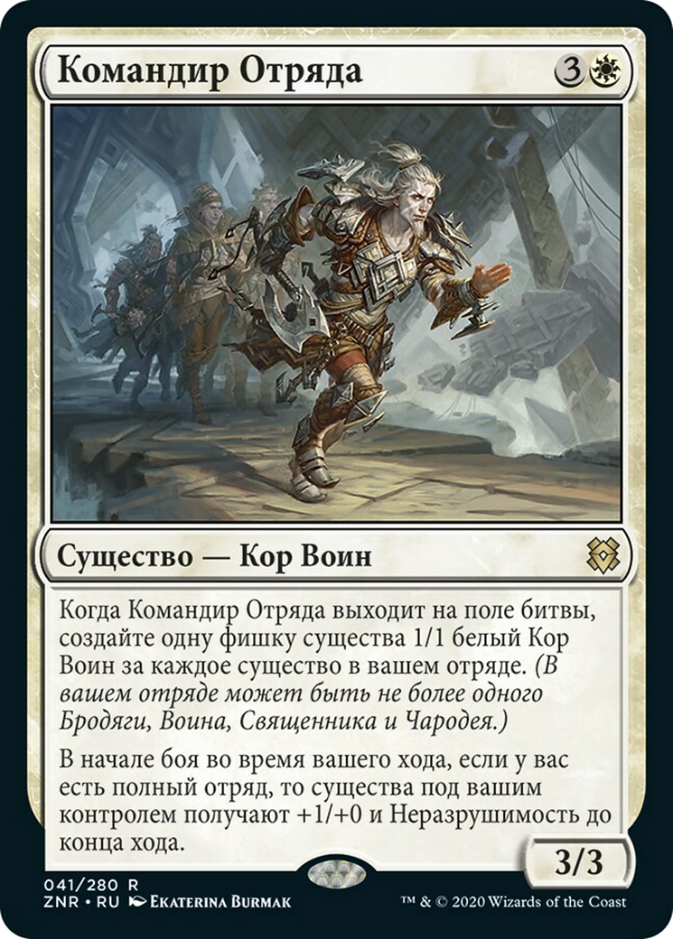 When Squad Commander enters the battlefield, create a 1/1 white Kor Warrior creature token for each creature in your party. (Your party consists of up to one each of Cleric, Rogue, Warrior, and Wizard.)